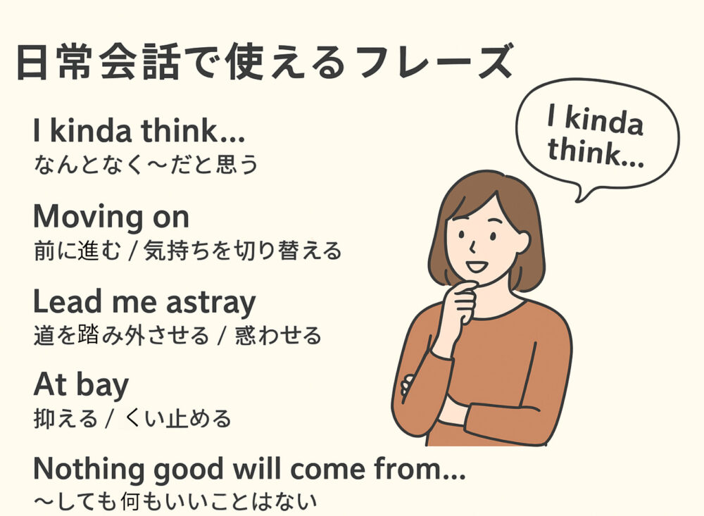 これらは日常会話でも登場する便利な表現です。特に「moving on」は、恋愛や仕事で使いやすいフレーズ。